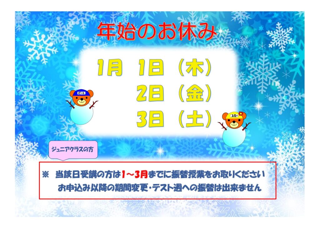 | 休館日 | 毎月29.30.31日と日曜日は休校日です その他の休校日はカレンダーをご確認ください |